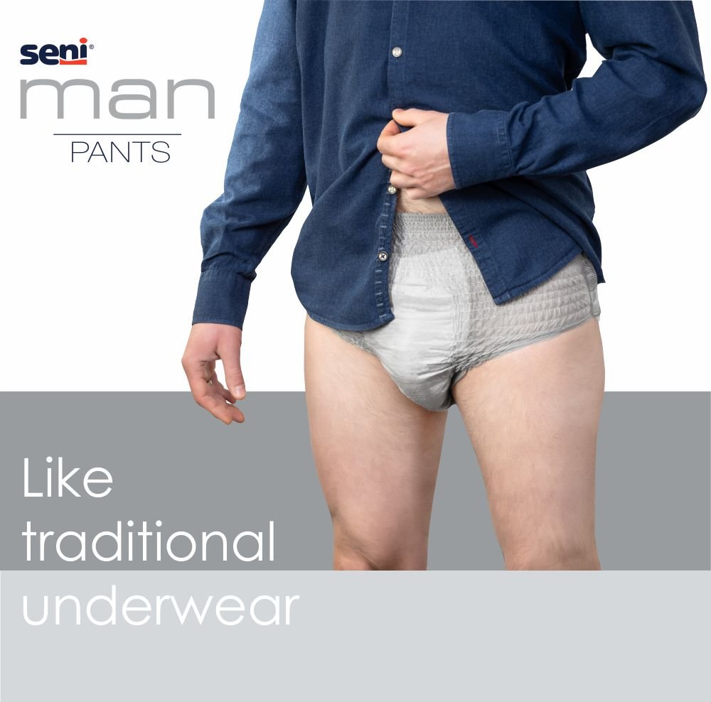 As cuecas descartáveis Seni Senhor são roupa interior absorvente para homens que vivem ativamente e que querem sentir-se secos independentemente da incontinência.