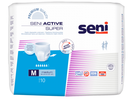Seni Super Active Classic pode ser usado na incontinência urinária e fecal. Pode ser facilmente descartado devido à fita adesiva que se encontra na parte de trás.
