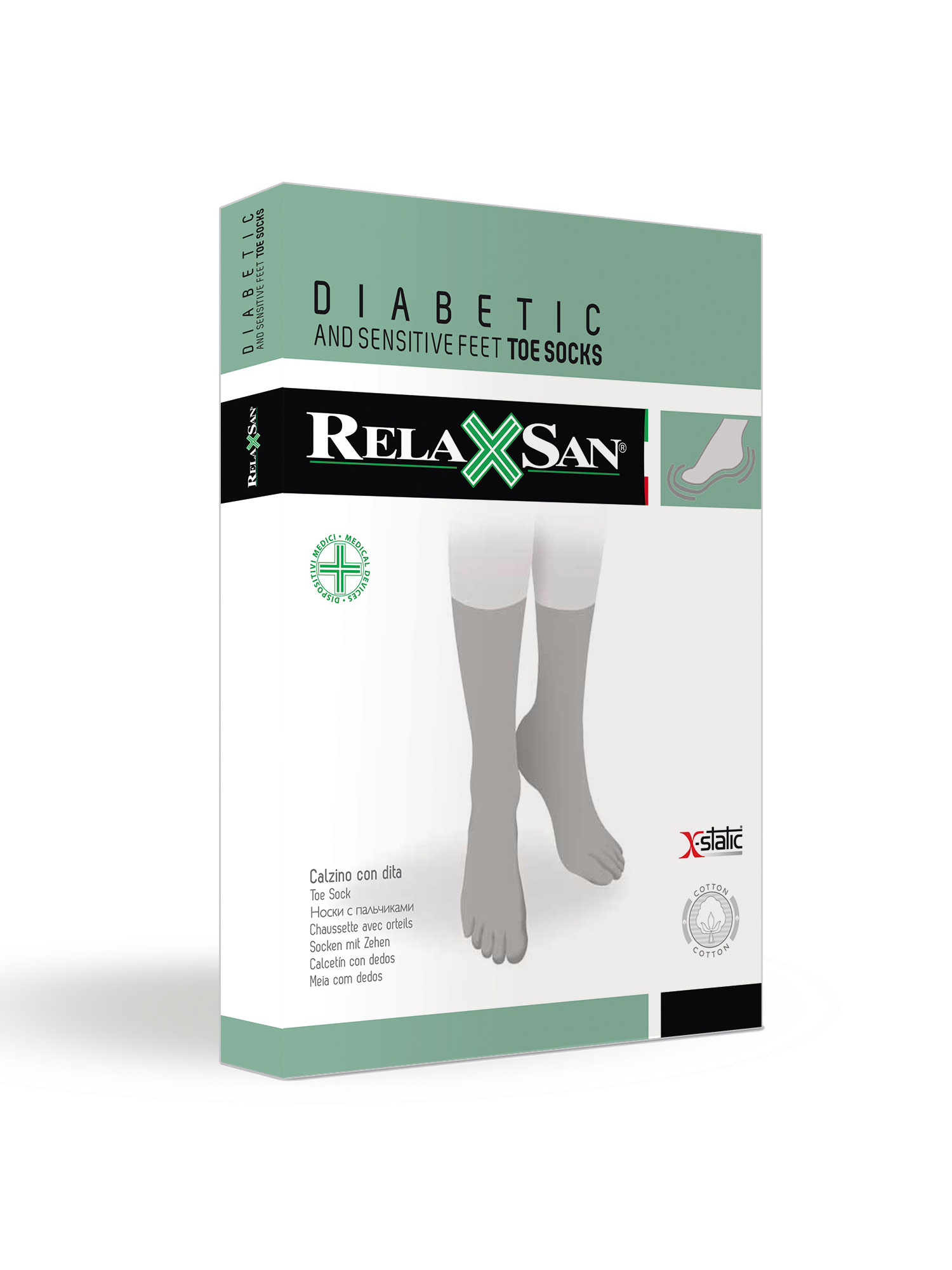 As Meias de Algodão Diabética Com Dedos são meias sem compressão unissexo que protegem e mantêm os dedos dos pés saudáveis devido à fibra de prata X-Static, presente nestas meias.