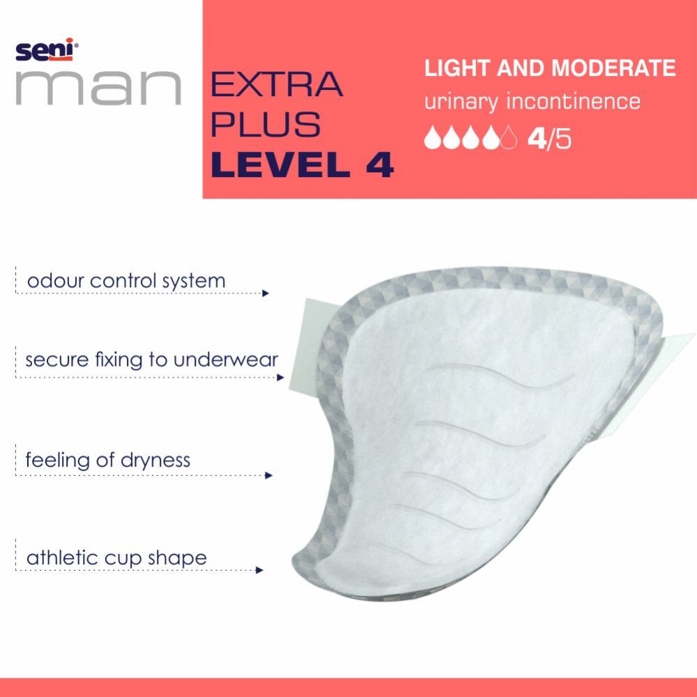 Os Pensos SENI Senhor Extra Plus são a solução para quem tem incontinência urinária nível 4. Com formato côncavo de acordo com a anatomia masculina. Estes garantem: