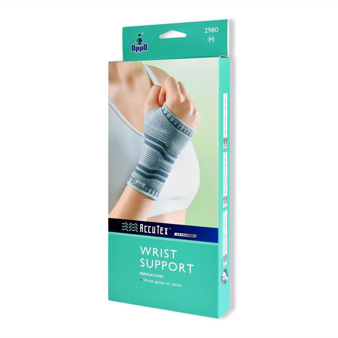 O Suporte de Pulso AccuTex Oppo auxilia nos casos de distensão e entorse do pulso, feito de malha de elevada densidade, com design anatômico.